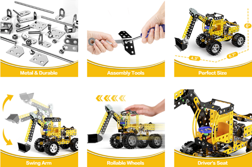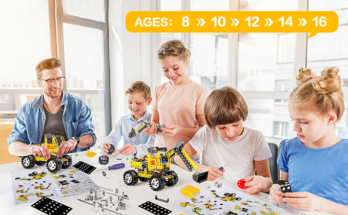 - STEM Building Toys For Kids Ages 8-12 - Our construction building toy is designed for 8+ years old kids, includes 256 parts, such as nuts, bolts, screwdrivers, and wrenches, made of durable metal. After the build is completed, The swing arm can swing freely, and the bulldozer can slide for a long distance with a little push. This stem building toy incorporates boring engineering knowledge and concepts into funny building games, aiming to improve children's STEM skills.