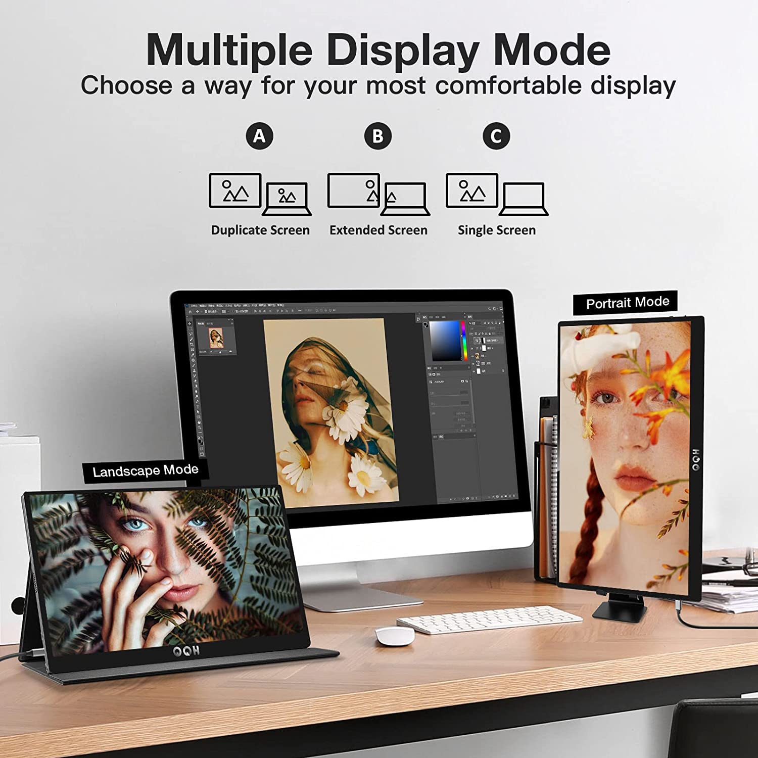 Multiple Functions for Your Comfort - QQH usb c laptop monitor screen extender with multiple display modes [Duplicate/Extend/Second Screen/Portrait]. Boosting your productivity anytime, anywhere. HDR mode can give you more realistic visual enjoyment, brighter highlights, stronger contrast, delivering a stunning viewing/gaming experience. Built-in dual speakers, 3.5mm audio jack, fully realized OSD Menu and other functions, QQH portable monitor can be your great gaming/working/travel partner.
