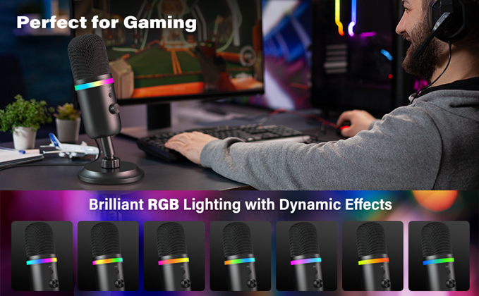 • BRILLIANT AND CONTROLLABLE RGB LIGHTING: The gaming microphone has 12 personalized RGB lighting modes which can be selected with a press of a button. The soft and coordinated light effects will make your video gaming or live streaming more eye-catching and fascinating. You can also choose to turn off the lighting effect!