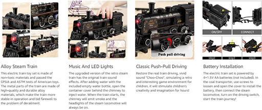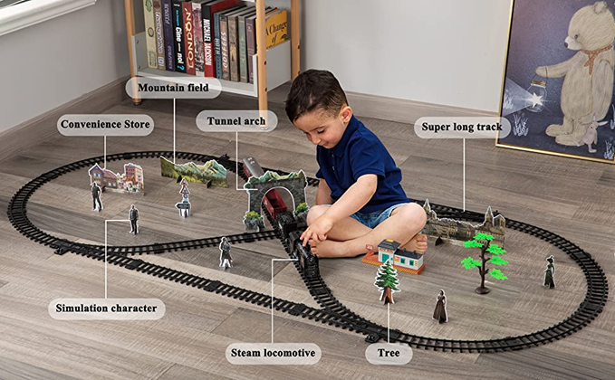 This is an interactive game toy. kids can play with their parents or friends. Under the vivid "Choo-Choo" sound and train lights, they can lead the children to experience the real retro train era. We also provide two different types of straight and curved tracks, children can DIY to create a creative and interesting game environment, which will stimulate unlimited imagination and hands-on ability, keep kids away from electronic products.