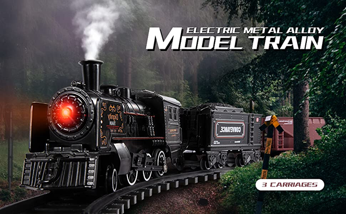 - Locomotive Features:Battery-powered, Authentic train sounds ,working headlights and realistic smoke to make the game process more exciting and funny. Also train set comes with an bonus-empty water bottle, you can add water into the container that behind chimney, then real smoke will be produced from chimney. Locomotive Engine require 4 AA Batteries, not included.