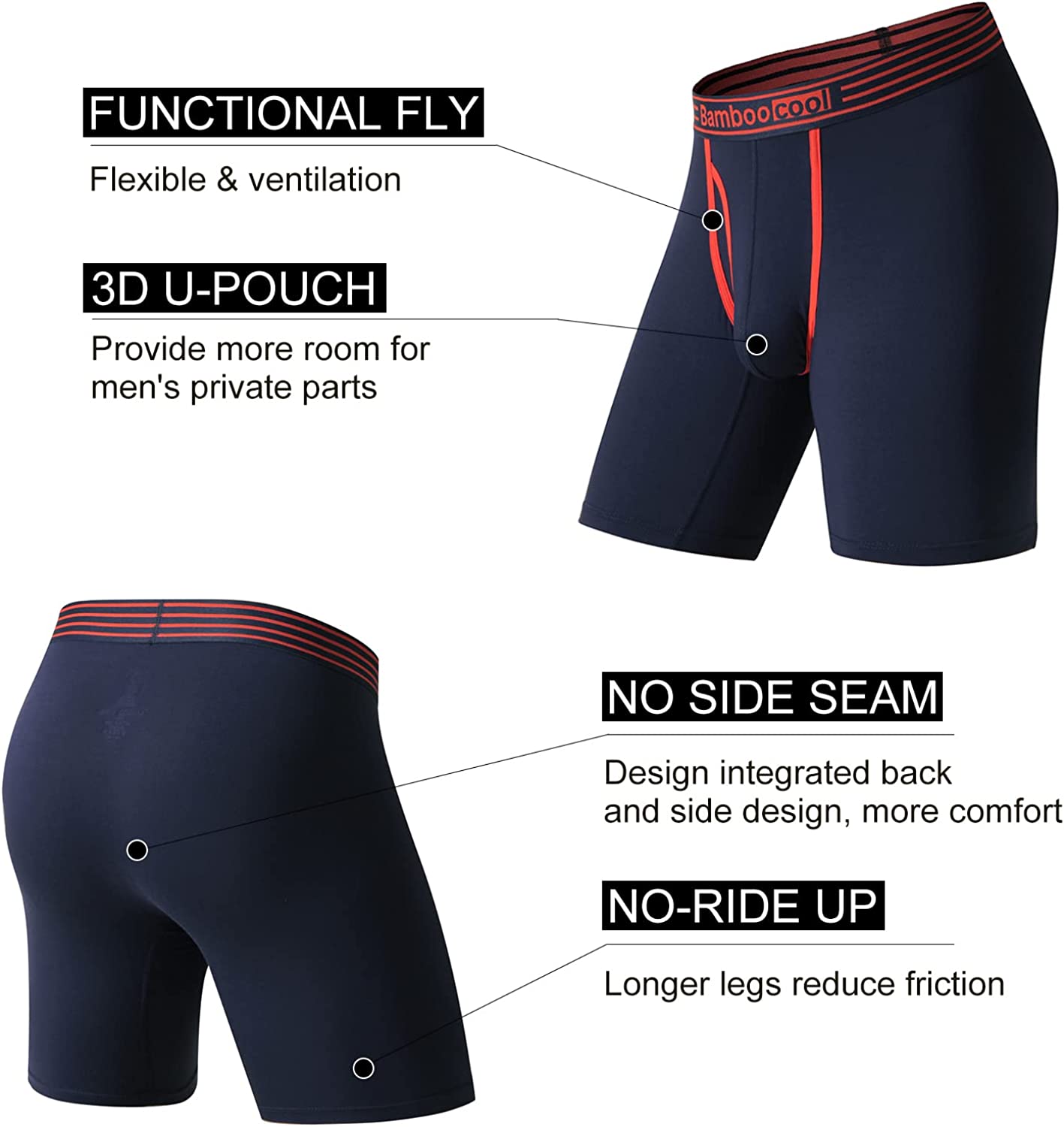 【NO-RIDE-UP LEG,BREATHABLE】: This fabric is 92% Bamboo Viscose & 8% Spandex, which is a lightweight, breathable, stretchy pair that won't fade or shrink fabric. Bamboo fabric has a natural moisture absorption and perspiration function, its air permeability is 3 times that of cotton.This is a kind of long leg boxer underwear.The design of lengthen the leg will more securely wrap the important parts of men, and effectively reduce the friction between the legs.