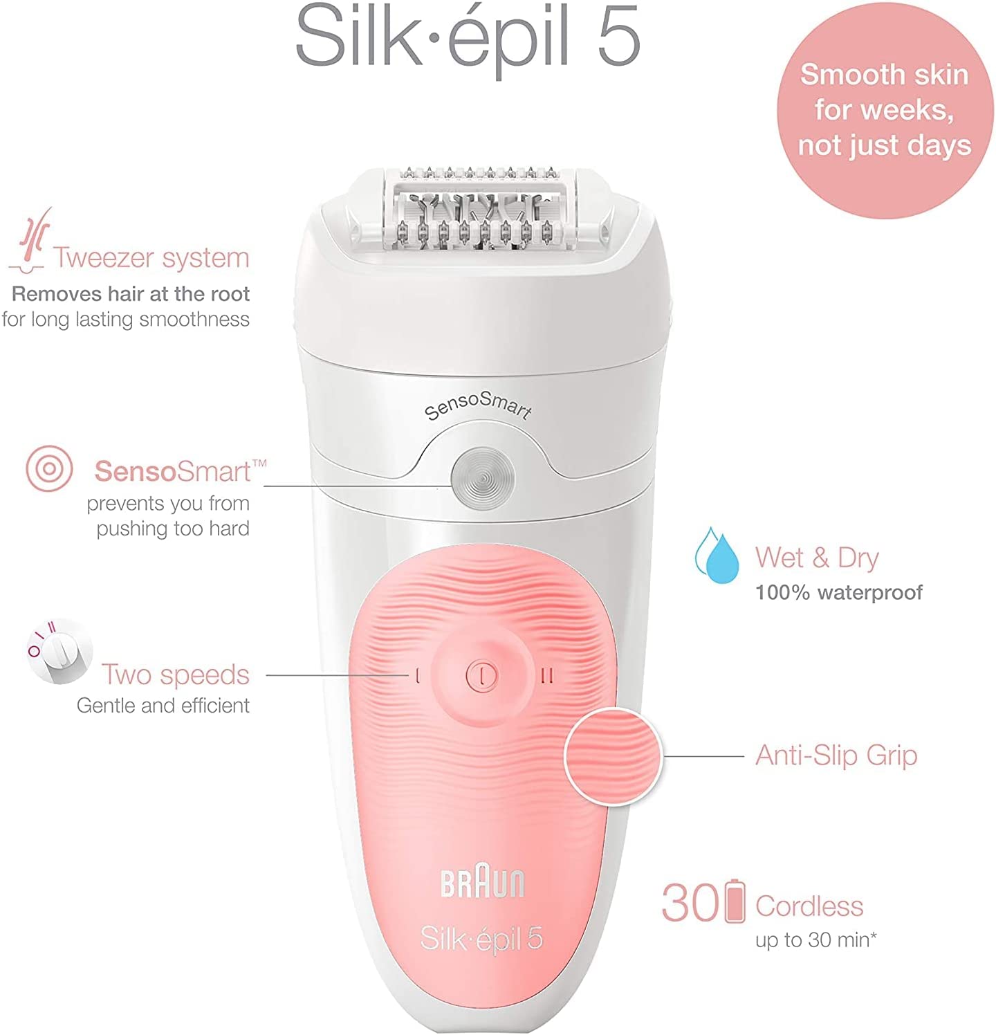 Meet the Beauty Set 5, the 6-in-1 hair removal and beauty set for face and body. Epilate, shave, trim, cleanse, exfoliate and apply creams and makeup. An exfoliating brush attachment removes dead skin cells to prevent ingrown hairs. The epilator removes 4x shorter hair than wax - for up to 4 weeks of smooth skin. The set includes a shaver and trimmer attachment for hair removal in sensitive areas. Three facial brush attachments for cleansing and exfoliating, and a makeup sponge for applying creams and makeup. Cordless use for up to 30 minutes. 100% Wet&Dry. Epilate while bathing or showering to reduce plucking sensation. With regular use, epilation is virtually painless.