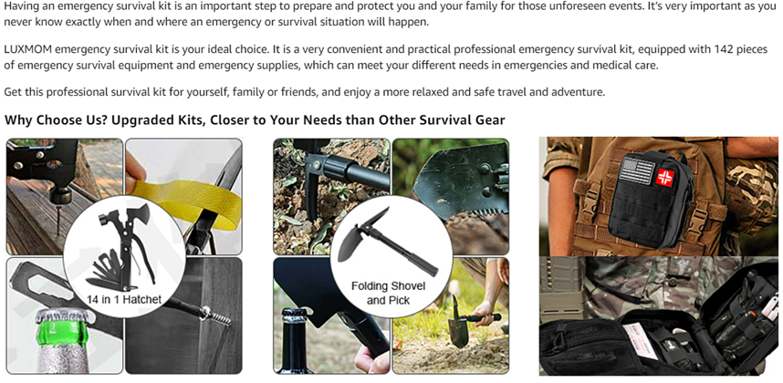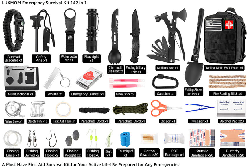 • 【Practical Survival Gears & First Aid Kit】LUXMOM emergency kit contains the most popular survival accessories: Hatchet, 3-mode flashlight, Multifunctional Card, Survival Bracelet, Dual-tube Whistle, Wire Saw, Parachute Cord, Emergency Blanket, fire starting tools, fishing tools, comprehensive first aid kit, etc. All these gears can make sure that the wound can be treated in time to prevent infections.