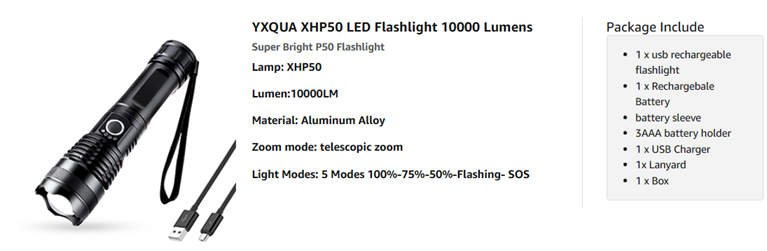 | Specific Uses | ● Long Range, ● Adjustable Light Modes, ● High Power, ● Adjustable Focus, ● Rechargeable, ● Impact Resistant |