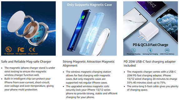 - Magnetic Wireless Charger + PD 20W USB C adapter + Phone charging stand