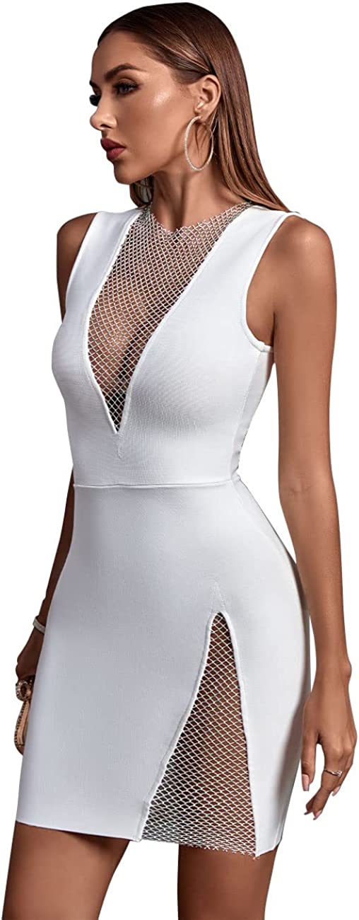 Features:Bandage dress with side split design,ubique waistline detail,plunge v neck,bodycon tight fit,embellished with mesh and rhinestones on the chest and legs,sleeveless and flattering mini length cut