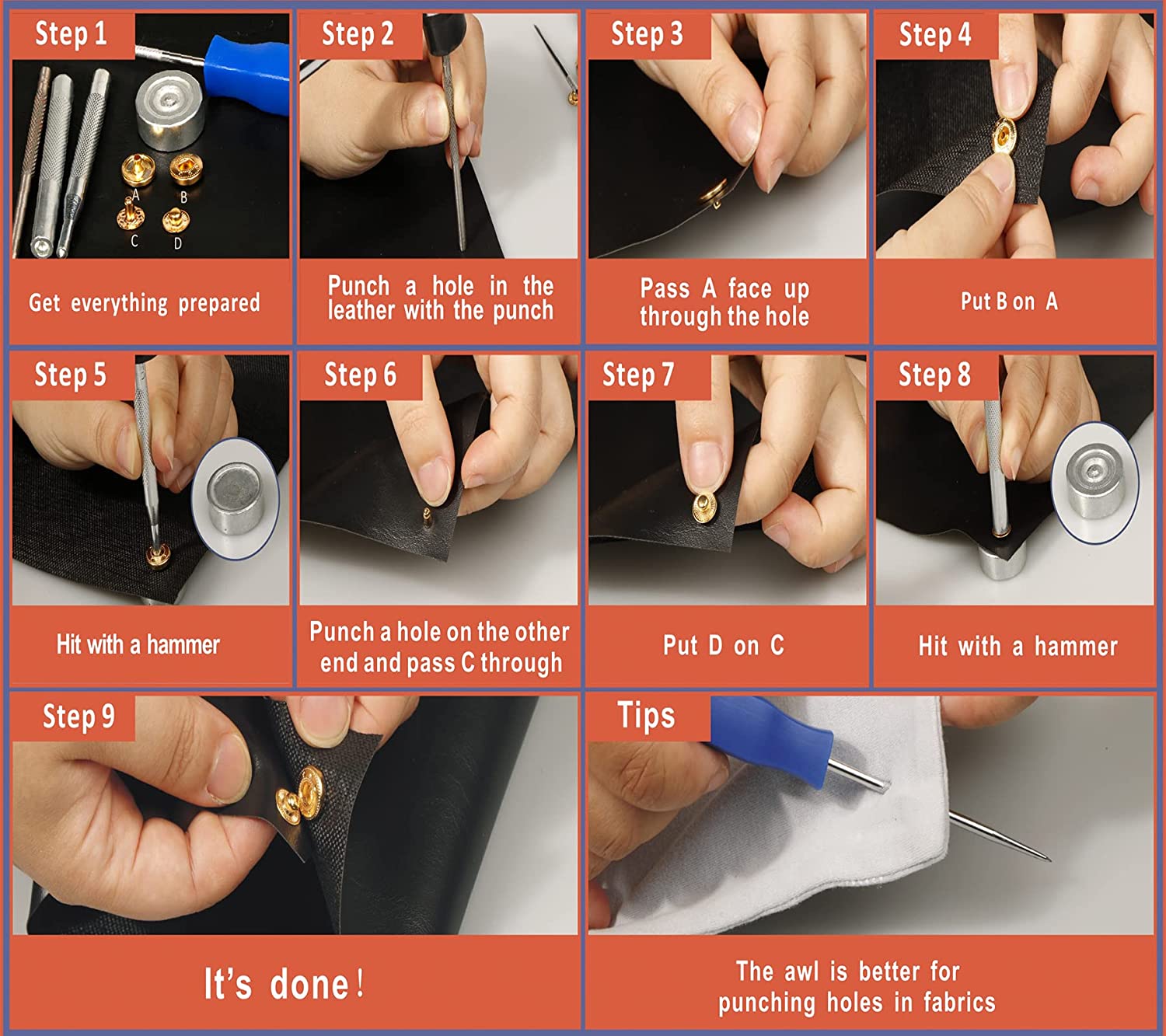 Complete Installation Kit: The snap fasteners kit includes a base, a punch tool, a point install tool, a concave install tool and an additional awl (The awl is more suitable for punching the fabric).