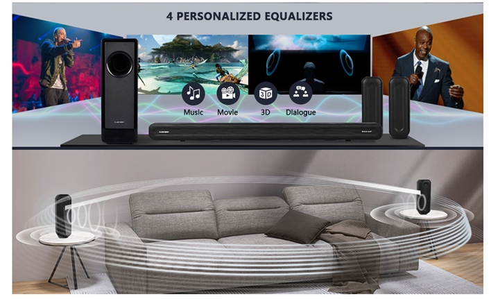 - OPTIMIZE ENTERTAINMENT WITH UPGRADED EQUALIZER MODE - Personalize different equalizer modes: Music, Movie, News & 3D mode, and more advanced setting by using the Smart remote control for hearing and feeling every musical, explosion, dialogue, and detail with transparent and ear-pleasing loudness up to 120 dB. The remote also increases or reduces Treble and Bass Levels based on your sounding preference. So, you can sit back, relax, and enjoy the best budget 5.1 surround sound system!