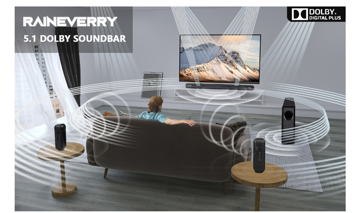 - 5.1-CHANNEL SURROUND SOUND EXPERIENCE - Fully enjoys the thrill of DOLBY DIGITAL PLUS with the newest 5.1 Surround sound Engine, DSP technology, and impressive 400W of total system power. Dolby Audio adds room-filling excitement with floor to ceiling virtualized surround sound experience. Immerse yourself with 360° room transforming sound that adapts to your environment with included wireless rear speakers, taking TV, movies, and music into a whole new dimension.