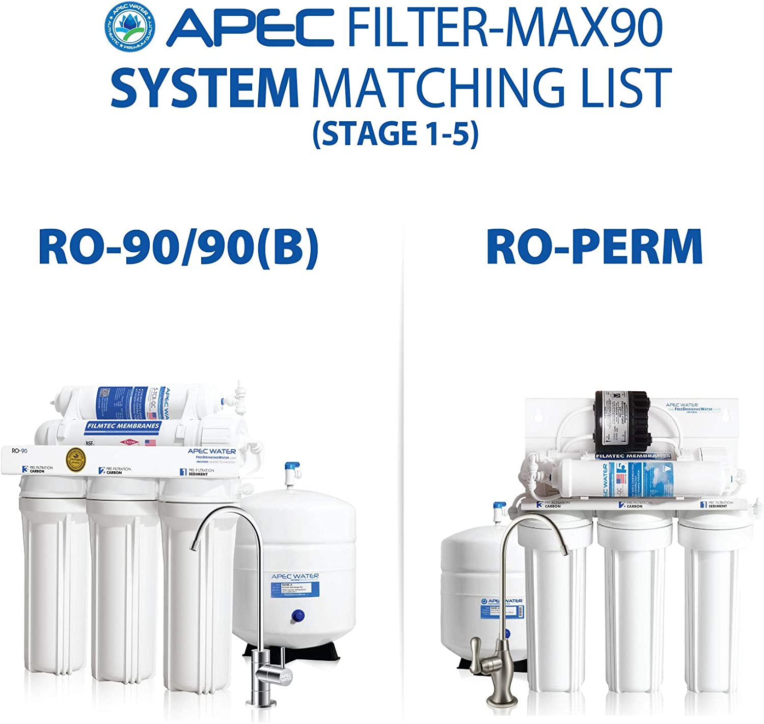 APEC Ultimate high flow 5-stage complete filter set is made in USA with the highest quality filtration components to provide a longer lasting filter set to protect and prolong the lifespan of your Reverse osmosis system. Premium quality pre-filter cartridges lasts over 12 months while the membrane and post carbon filter last 3-5 years for fewer filter change outs and high performance impurity removal. Compatible for APEC RO-90, RO-PERM, and all other standard size under counter 50-90 GPD RO systems on the market.