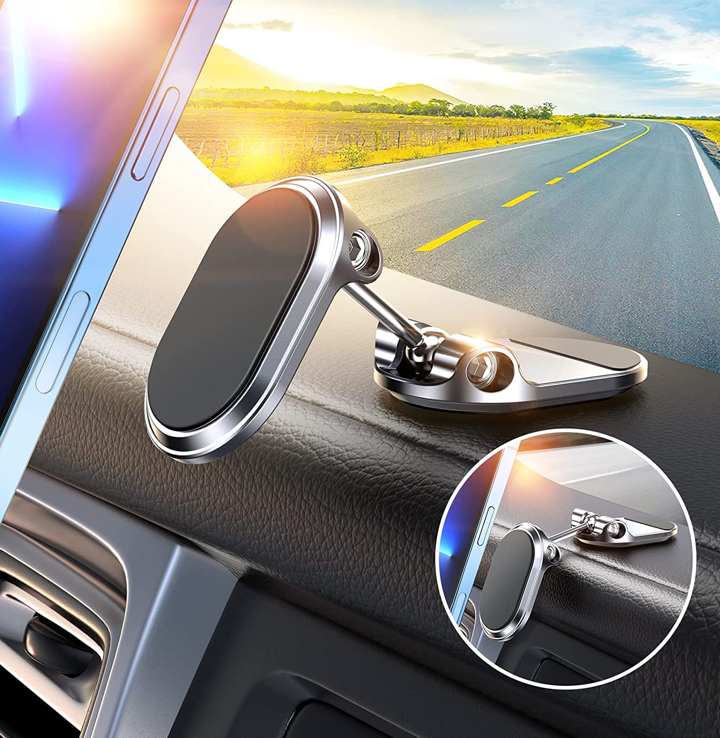 Dual 360 degree and easy to install: The magnetic car phone holder is a portable accessory. It does not block any view while driving. Equipped with double 360 degree adjustable connector ball, you can adjust the angle of the phone at will. Please find detailed installation diagrams on the product page, correct installation can avoid a lot of unnecessary trouble.