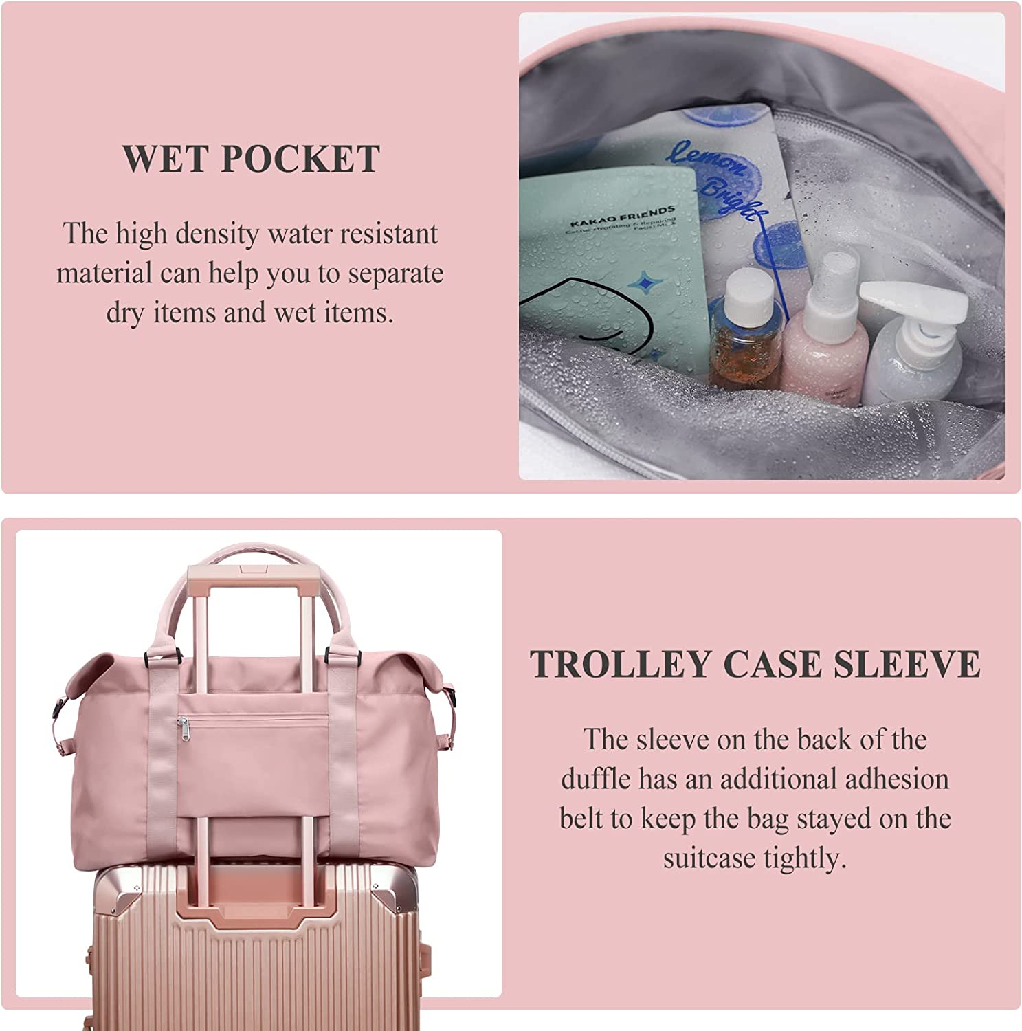 【Duffel Bag with Wet Pocket】This travel duffle bag for women comes with a wet compartment that way you can separate items in your bag. For example you go to the beach and want to change but your clothes are wet and you don't want to get everything else wet. Also if you have travel size toiletries that you are worried about leaking.