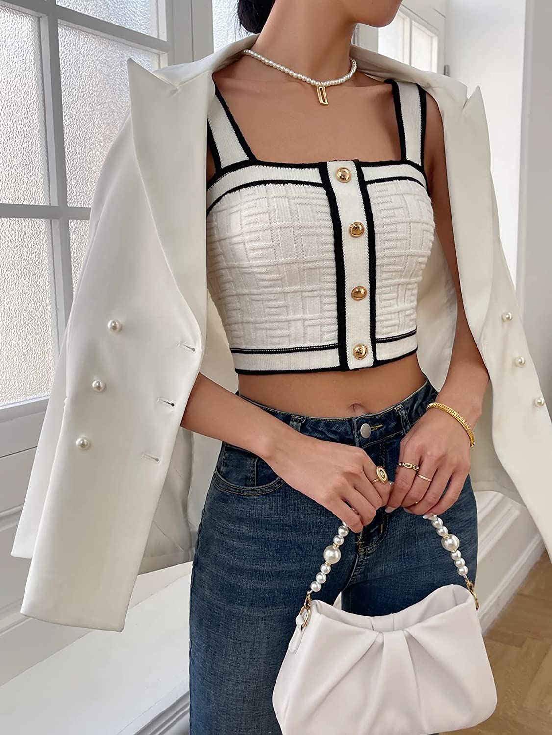 This crop top features knitted fabric and contrast trim
