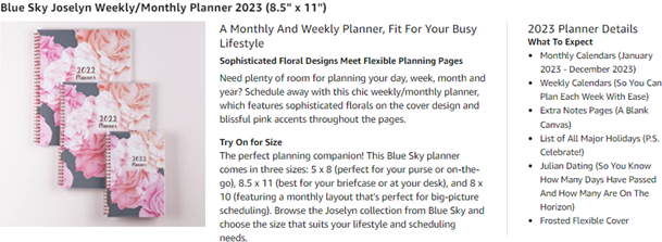 Plan your year in style with the beautiful florals and rich colors of the 2023 calendar year Joselyn collection. This stylish weekly and monthly planner will keep you organized everywhere you go. Simple page designs add a touch of sophistication and offer plenty of room for all of your important information. Designed with practicality and ease of use in mind, this floral agenda's monthly calendar tabs allow for easy access to each month’s plans while weekly views offer ample writing space for detailing each day. High quality white paper provides clean writing space for jotting down your appointments, to-dos and reminders. Use this dated planner to keep track of your appointments, and to write down notes and ideas in one place. Durable coated tabbed dividers are long lasting and make accessing information a breeze. Premium quality covers and twin-wire binding provide reliable durability for daily use. Stay on track throughout the year with this 8.5 x 11 planner dated January 2023 - December 2023. Mix and match with other Joselyn Collection planning products from Blue Sky to organize your daily life.