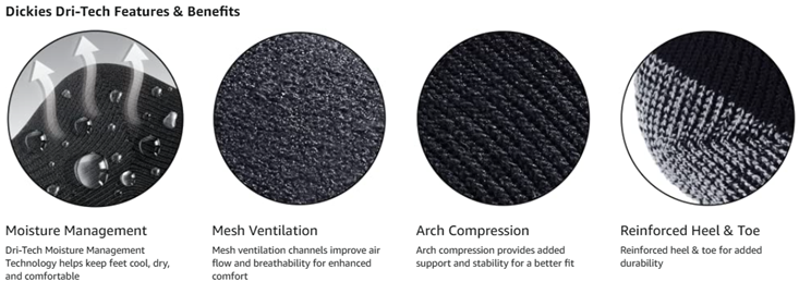 Dickies DRI-TECH comfort 6, 12, and 18 packs with wicking, moisture-management fibers keep feet dry, ventilation channels engineered for air circulation and moisture control, arch support hugs feet and keeps socks in place while providing in-step support, superior fit, and full-cushion comfort.