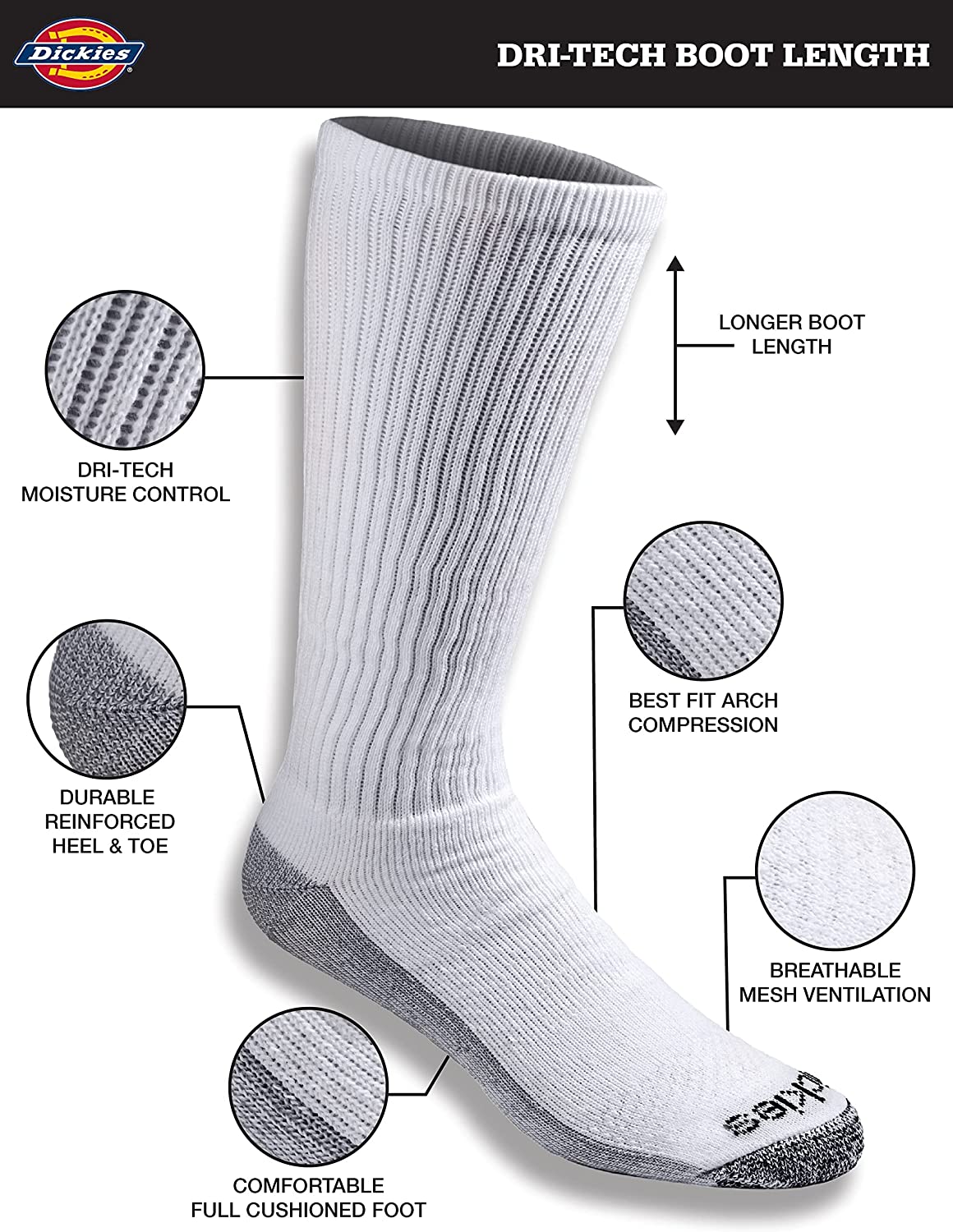 Dickies Dri-tech comfort 6 Pairs best work boot length socks with wicking, moisture management fibers keeps feet dry, ventilation channels engineered for air circulation and moisture control, arch compression hugs feet and keeps socks in place, while providing in-step support, Reciprocated heel and toe for superior fit and full cushion comfort.