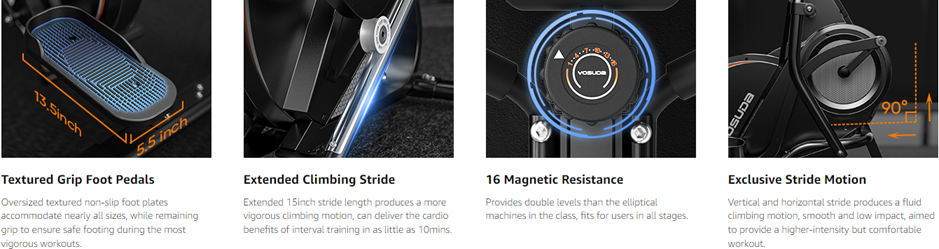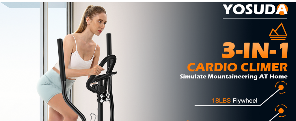 • 【3-IN-1 Home Gym Equipment】YOSUDA elliptical stepper combines the easy, low-impact motion of an Elliptical, and the cardiorespiratory improving power of a Stepper, with calorie burning power of a Treadmill. Extended vertical and horizontal stride length produces a fluid climbing motion aimed to engage your whole body.