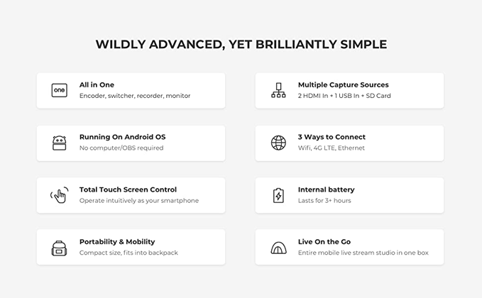 - All-In-One Versatility: YoloLiv Instream is a full HD live broadcast device integrating encoder, switcher, monitor and recorder, with built-in battery and native support for 4G LTE, WiFi, Ethernet. Perfect for traditional videography customer groups, like worship, weddings/funerals, sport, events, education, and NEW verticals like creators, influencers, storytellers, live-sellers and much more.