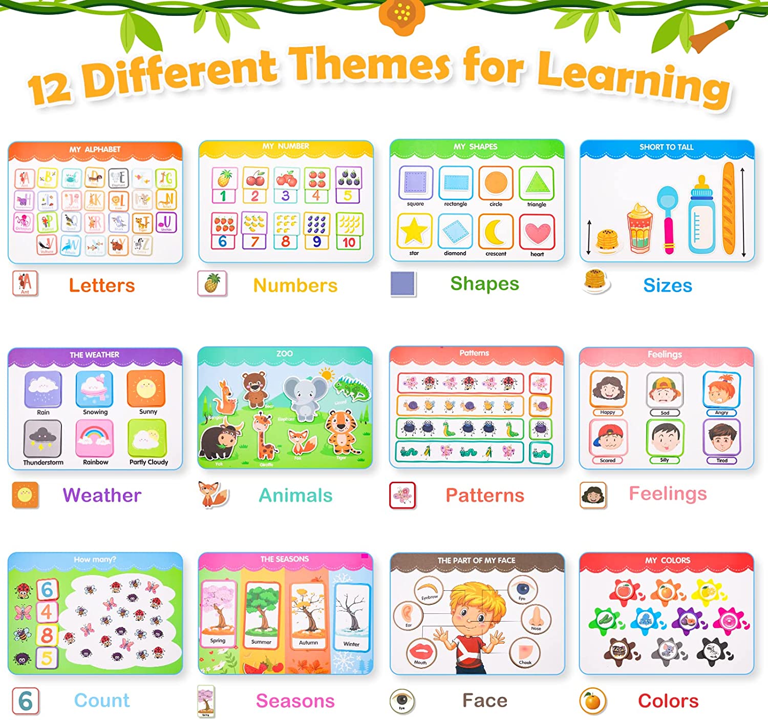 - 【Toddler Activity Book with 12 Themes】This preschool learning book is designed with 12 themes for children to learn. Toddler book includes letters, numbers, shapes, sizes, weather, animals, match patterns, feelings, count, seasons, facial recognition, and colors.