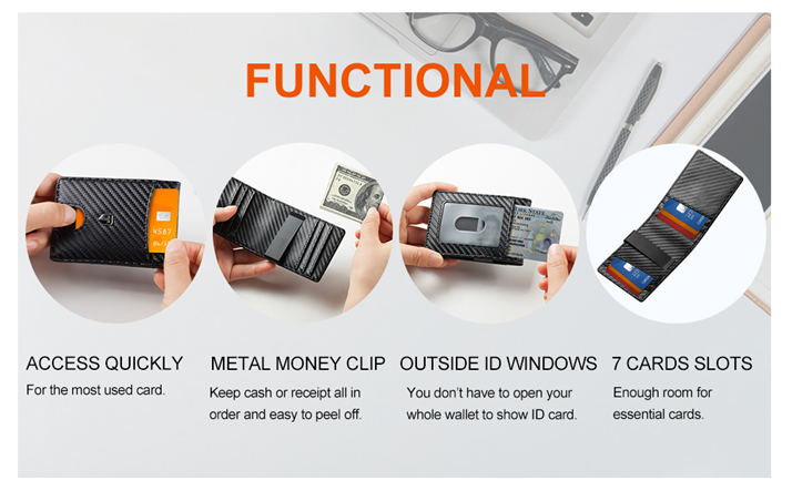 • LARGER CAPACITY - 7 card slots, 1 outside id window, 1 manganese steel money clip for cash or receipt which keeps them all in order and easy to peel off.