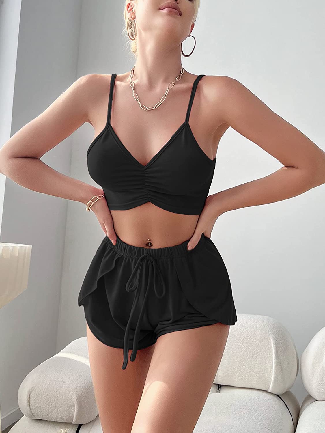 SweatyRocks Women's 2 Piece Lounge Set Ruched V Neck Cami Crop Top and Shorts Pajama Set