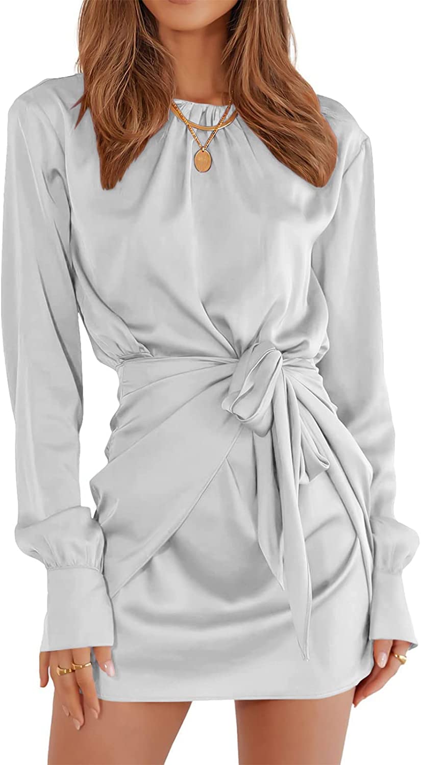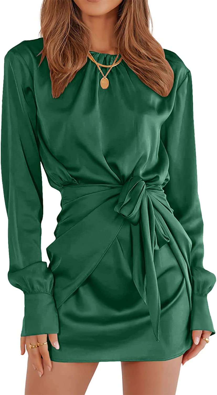ANRABESS Women Casual Long Sleeve Crewneck Ruched Wrap Short Party Dress Tie Waist Satin Cocktail Dress