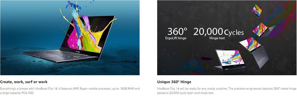 ASUS VivoBook Flip 14 is a convertible laptop that’s full of personality, sporting a sleek Bespoke Black finish and a color-blocked Enter key with yellow edges and text. Ready for performance, VivoBook Flip 14 is powered by up to an AMD Ryzen 7 5700 mobile processor with 8GB memory and features a up to 512GB PCIe SSD. A sturdy 360° hinge holds the display firmly at any angle, giving you the flexibility to use VivoBook Flip 14 as a traditional laptop, a tablet, or anything in between. For Free Windows 11 upgrade eligible devices, visit ASUS Windows 11 website for more information.