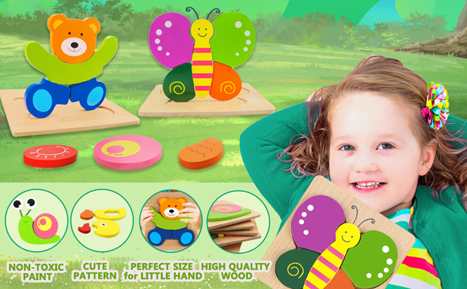 【HIGH-QUALITY WOODEN PUZZLES】Made of high-quality, environmental wood with non-toxic water-based paint and have no irritating smell. Smooth edges and easy-grip design allow toddlers to practice and play better. Fits wooden puzzles for toddlers 1-3 toys.