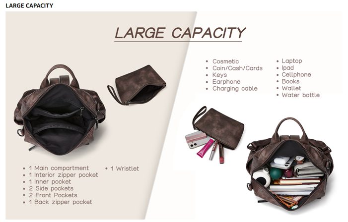 【DIMENSION & LARGE CAPACITY】 Backpack: (L) 12x (W) 5.5x (H) 14 inches. Wristlet: (L) 7 x (H) 5.25 inches. This backpack has many pockets, 2 on the front, 2 on each side, 2 inside, and it includs a security pocket on the back so there are no concerns about valuables being stolen from behind. The cute wristlet provids more room to organize your essentials.