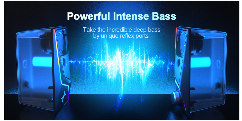 - 【Unique Speaker Ports for Deep Bass】Designed with 2 unique speaker ports, resulting in a strong vibration energy for a concentrated and rich bass sound. This will quickly be your favorite computer speakers for your desktop or laptop for movies, videos and gaming.