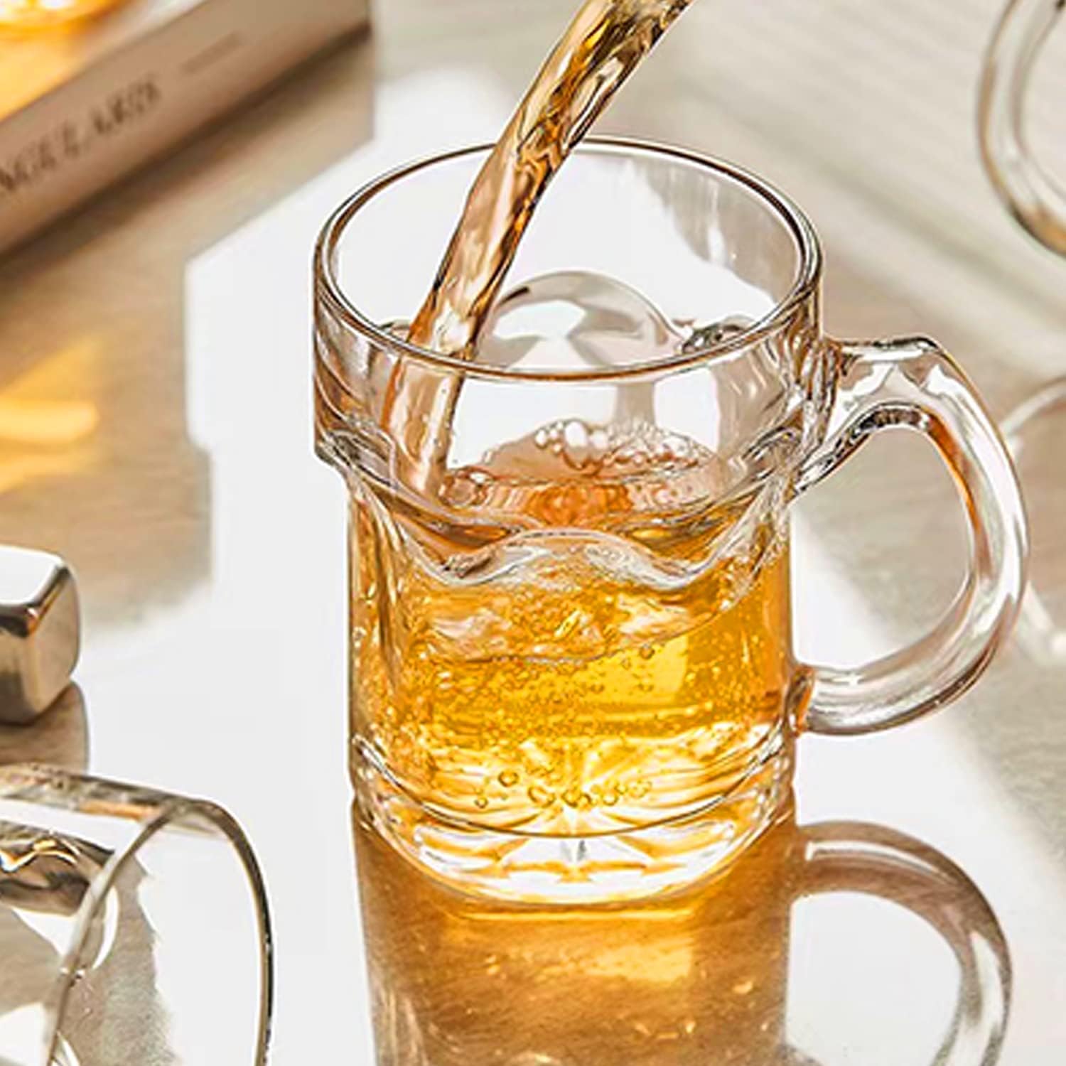 Ergonomically Handle-Feature with ergonomically handle which is easy to take up and down,perfect size to fit your hand properly,easy to grasp while allowing comfortable use for you to enjoy your favorite drinks in this elegant glass mugs.