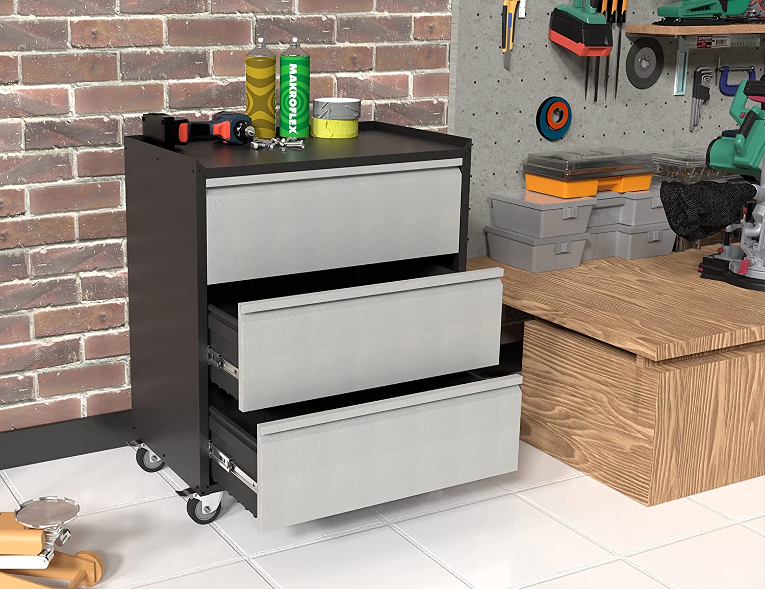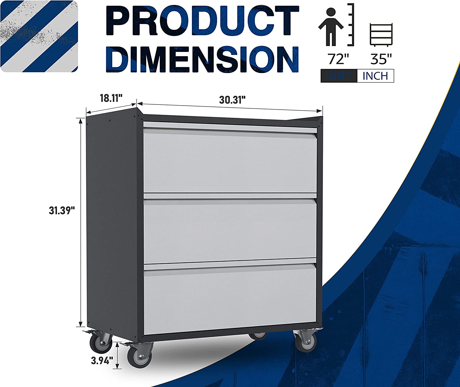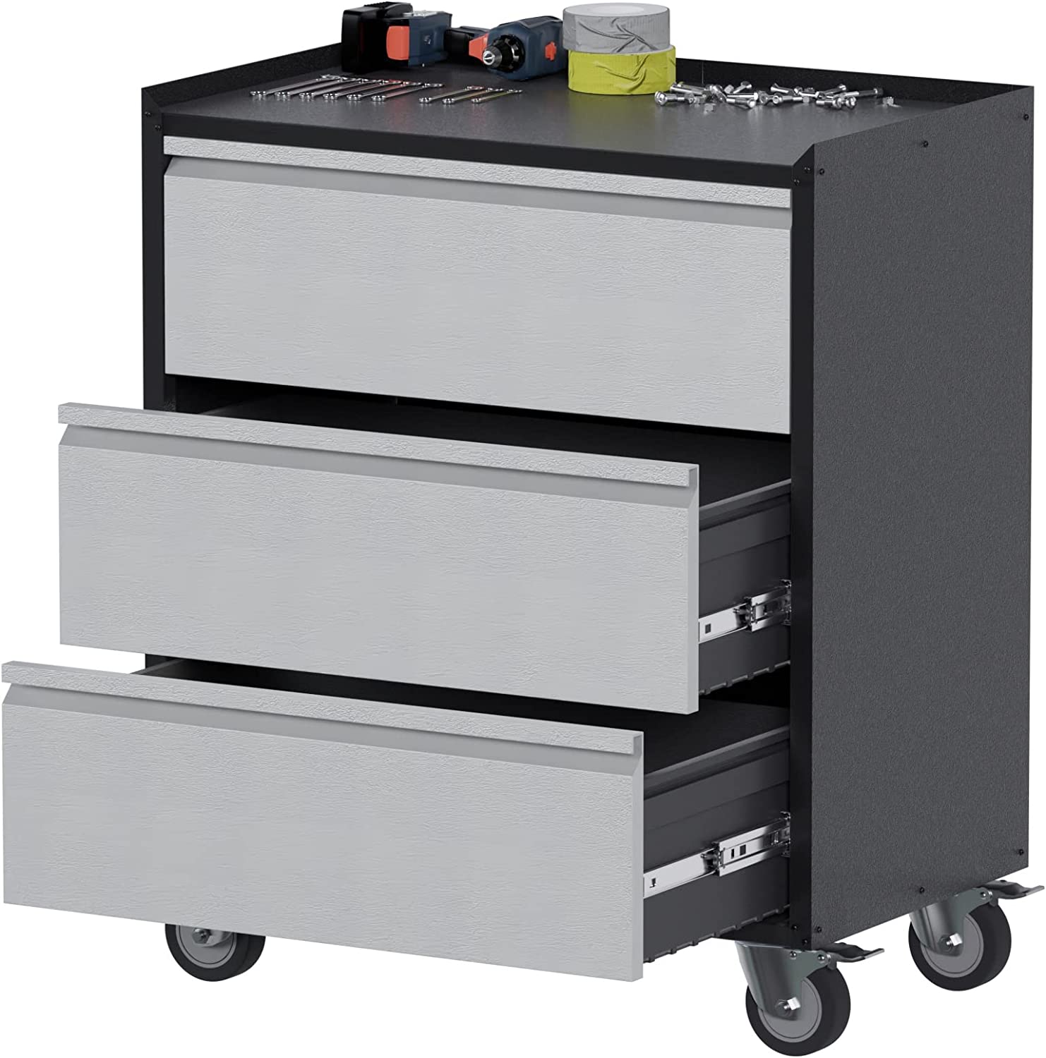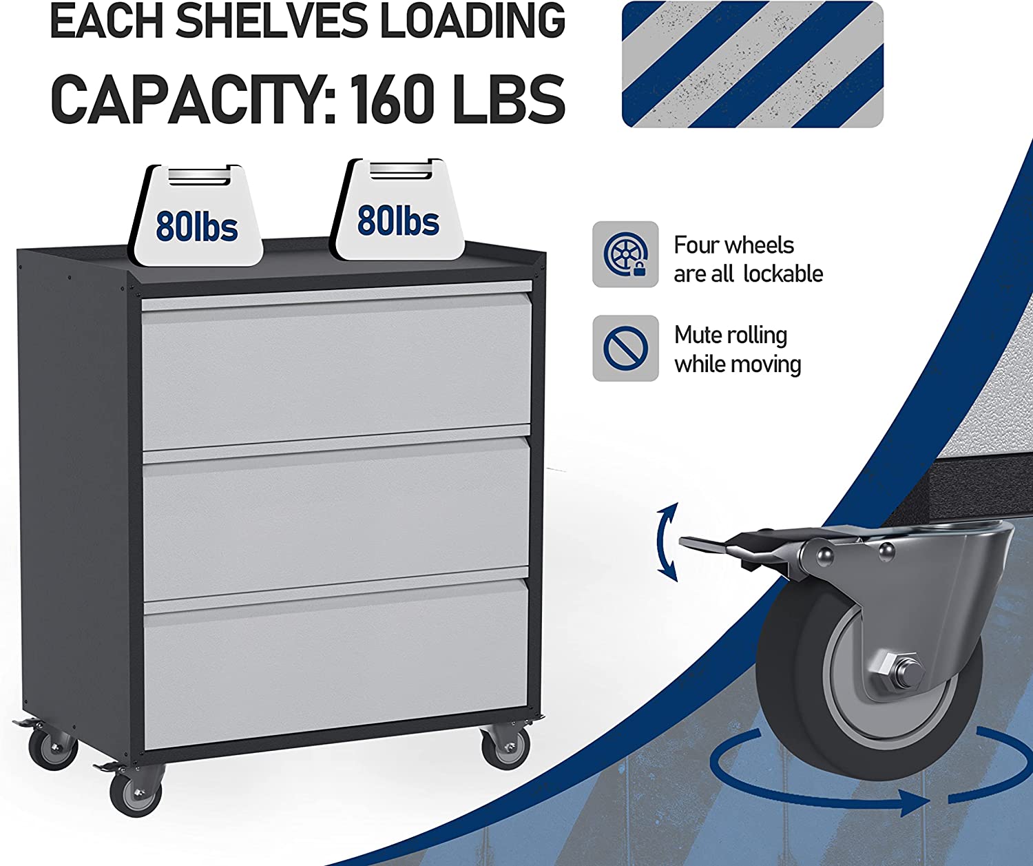 Aobabo Tool Storage Garage Cabinet with Wheels, 3 Drawer Tool Chest Rolling Metal Storage Cabinet on Wheels, Assembly Required, Black/Gray
