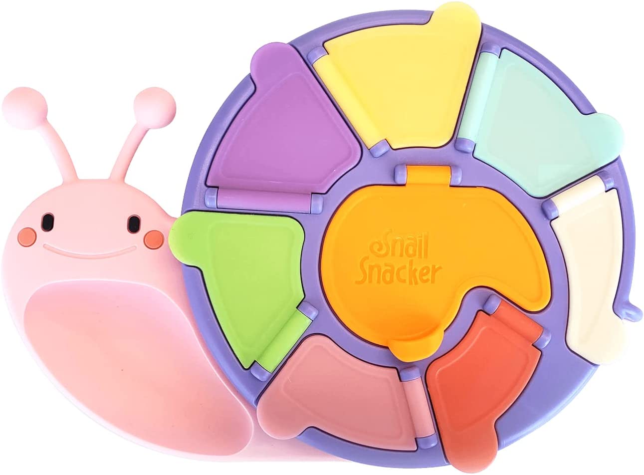 BoBaby Snail Snacker - Toddler Snack Container with 8 Sections and Lid | Food Grade Materials | Dishwasher Safe | Non-Skid Base | for Kids, Babies, Home & Travel | Educational (Pink)
