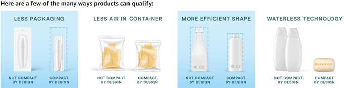 We created Compact by Design to identify products that, while they may not always look very different, have a more efficient design. With the removal of excess air and water, products require less packaging and become more efficient to ship. At scale, these small differences in product size and weight lead to significant carbon emission reductions.