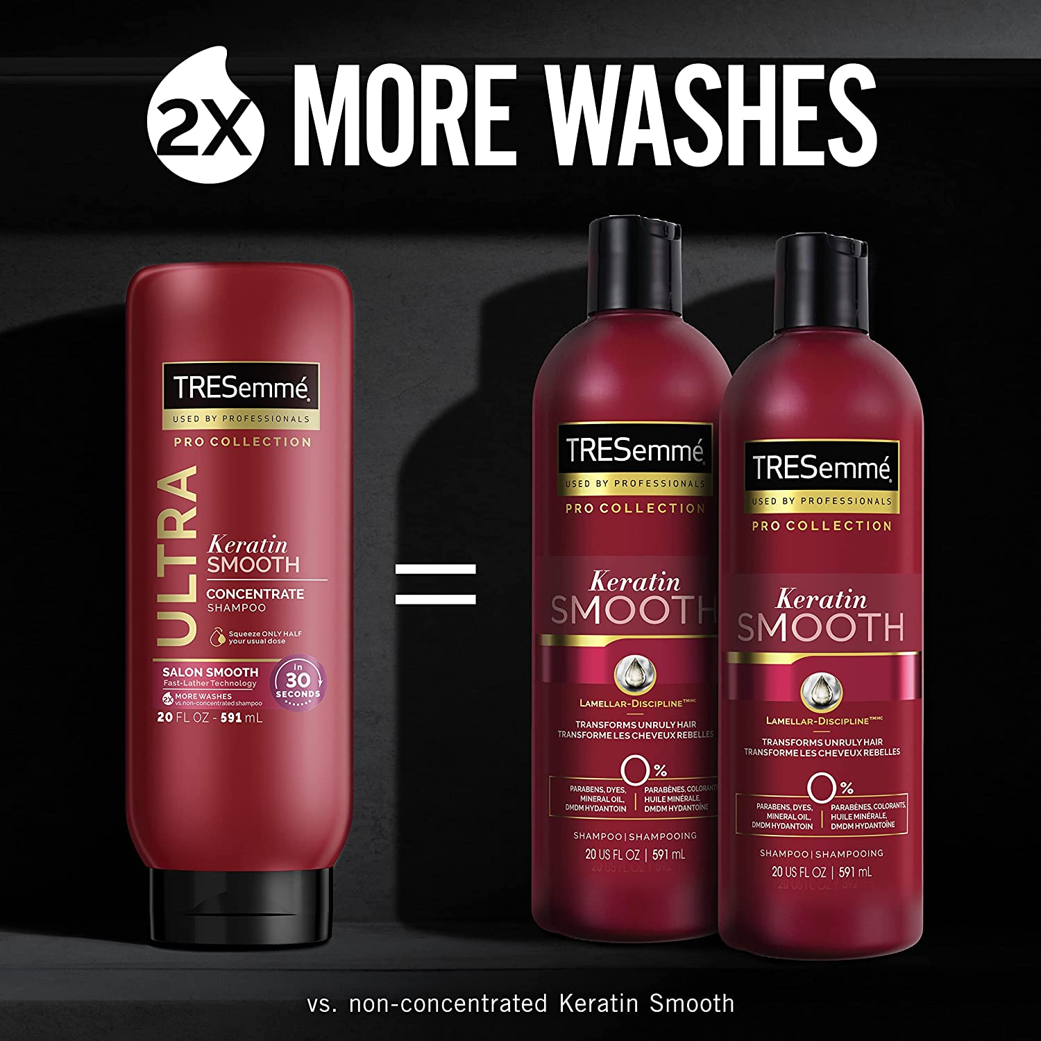 TRESemmé Ultra Keratin Smooth Concentrate System delivers salon-level smoothness and shine in 30 seconds and transforms frizzy hair. This shampoo and conditioner system delivers 2X more washes* and contains 2X the keratin smoothing actives per concentrated drop.