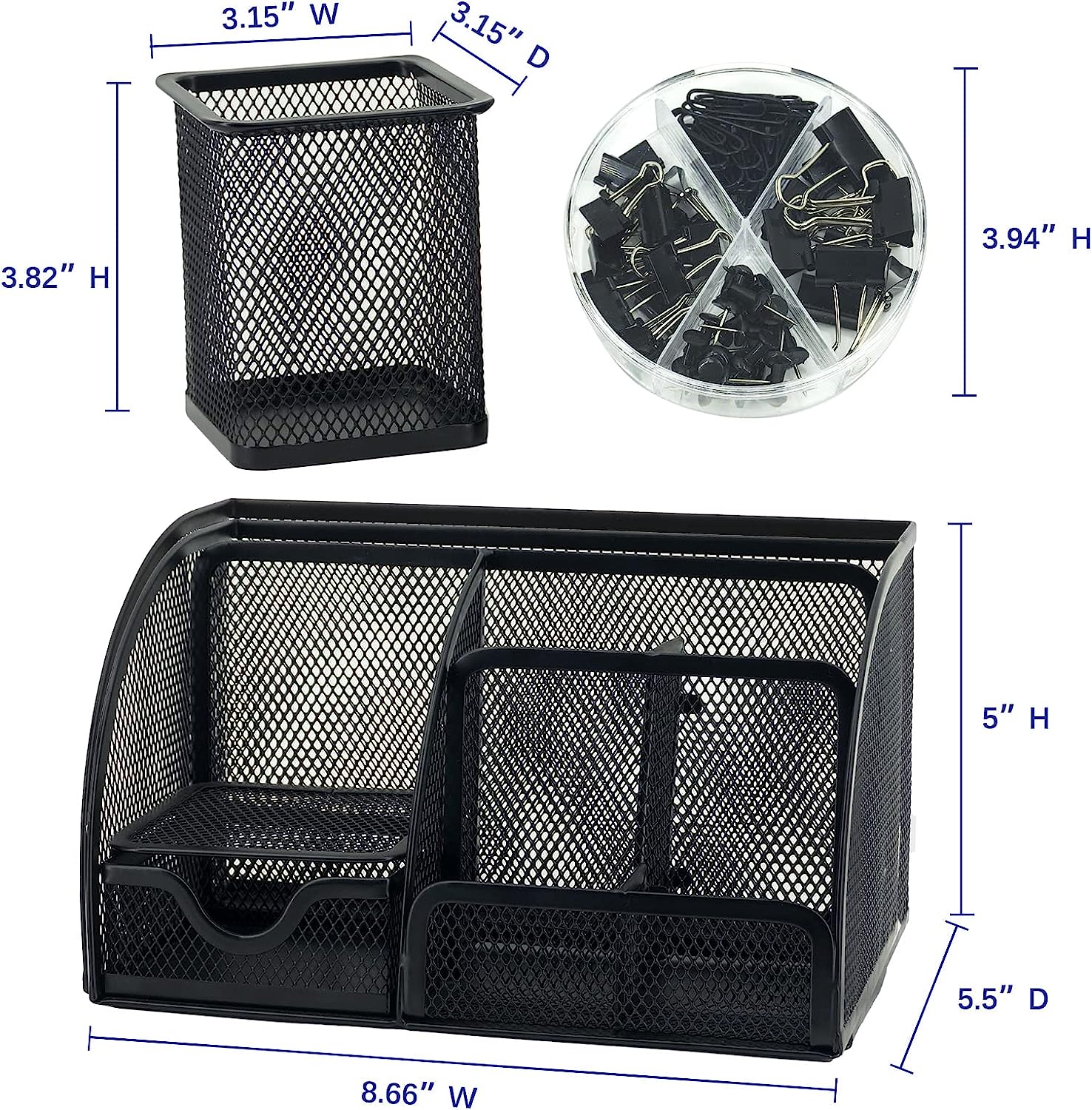 - [Durable and Versatile Design]This desktop organizer is not just for office supplies. Use it to store cosmetics, jewelry, mobile phones, business cards, and more. It's also a great choice for kids' desk organizers and storage. Made from lightweight mesh metal, this desk organizer is both sturdy and durable. The pen cup is designed to quickly store all kinds of pens and stationery.