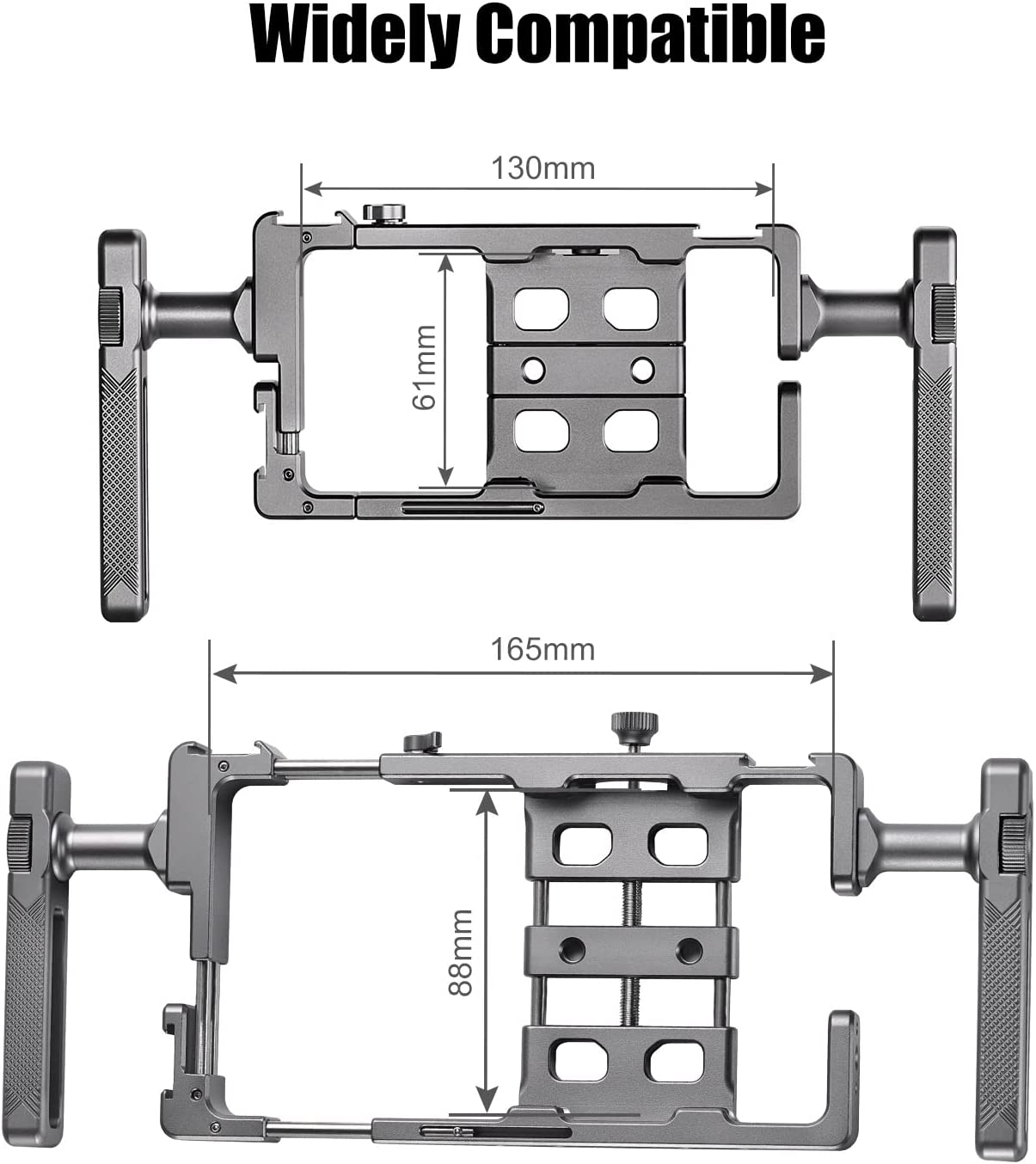 Protective Cage: The length and the width of the cage are independently adjustable so it fits well with your phone; and your phone will be kept securely in place thanks to the inward-angled jaws which lined with firm rubber pads to effectively avoid scratches as well as accidental dropping.