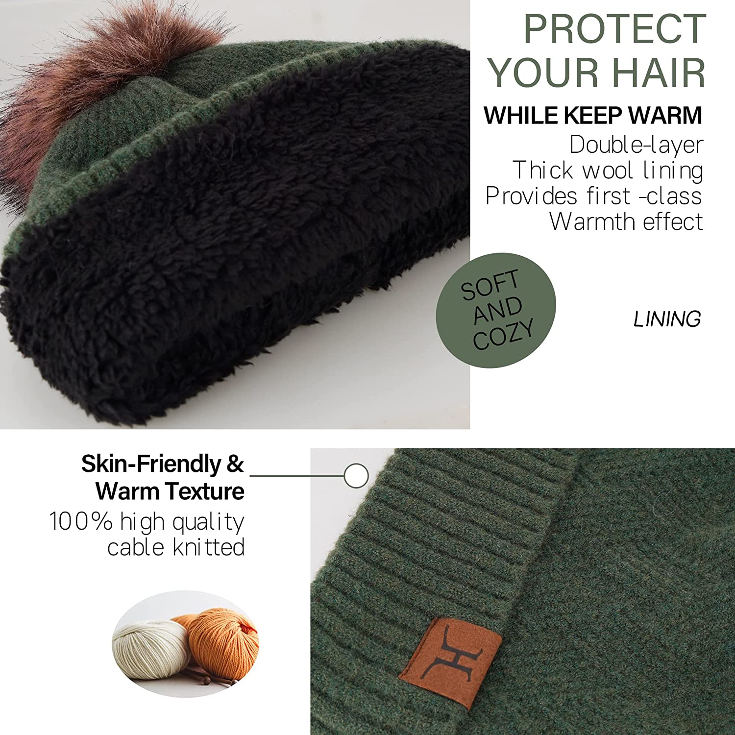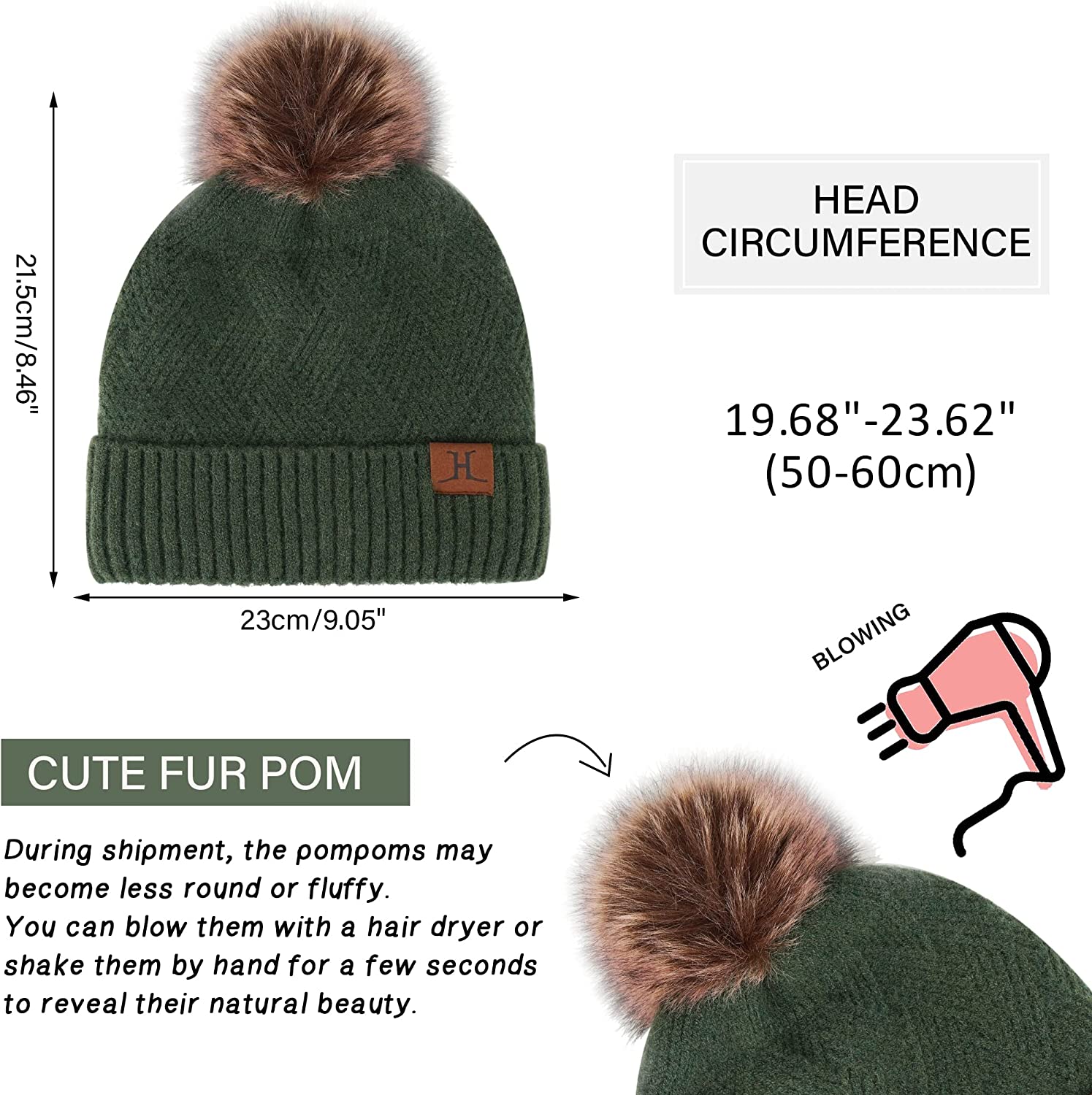 • Warm Hat Gloves Scarf Suit: Excellent elasticity makes it suitable for any head shape, hand shape, easy to put on and take off, one size fits all: Beanie Hat: 23x21.5cm/9.05" x 8.46", Long Scarf: 180x27cm/70.86" x 10.63", Touchscreen Gloves: 23x9cm/9.05" x 3.54". This cute women's fleece thermal hat designed with chic diamond knit texture and a pop of solid color. Faux plush pom-poms at the top of the hat are youthful and playful. Set warmth, comfort, elegance and fashion in one.
