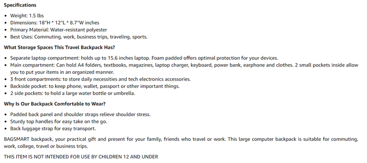 Large Capacity: The travel backpack has multiple organized pockets, up to 7 compartments. Comes with separate laptop compartments to protect a 15.6 inch laptop; a large main compartment to store daily supplies, such as A4 folders, textbooks, magazines, laptop charger, keyboard, power bank and clothes. 2 small pockets added allowing your small items in an organized manner. Dimensions 18 * 12 * 8.7 inches
