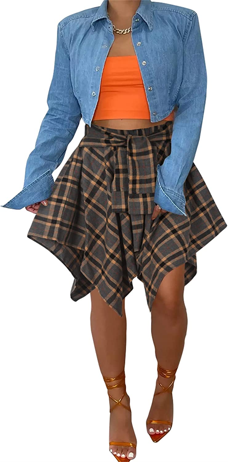 Features: 90s vibes plaid pattern, grunge pleated design, irregular hem, flared A-line shape, and elastic waist, shirt-sleeve-style ties design, just like tying plaid overshirts around our waist.