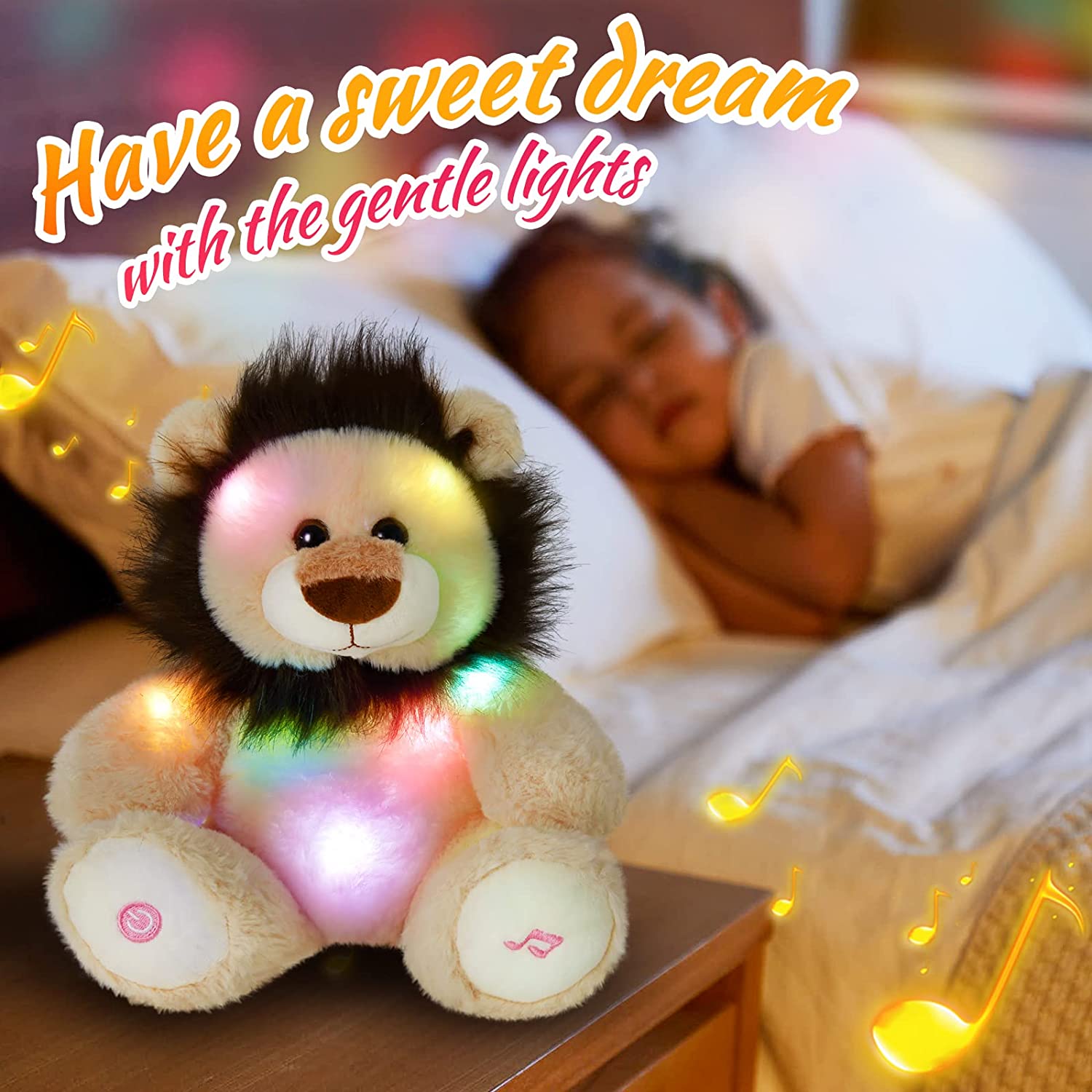 10 LULLABIES INSIDE-There are 10 nursery songs inside the lion stuffed animal: Mary Had a Little Lamb, Rain Rain Go Away, Twinkle Twinkle Little Star, Five Little Monkeys, Hickory Dickory Dock, The Wheels on the Bus, Do Re Mi, Fishing Fishing, If You are Happy and You Know It. All of the sings are sung by clear voice, your kids can learn to sing with the lovely friend. Play with the lion during the day and at night.