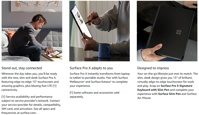 You’re always one step ahead. So is Surface Pro X. Sleek design and ultimate mobility combine with razor-thin bezels that take your ideas to the edge of the brilliant 13” touchscreen. Stay connected and work more efficiently anywhere with blazing-fast LTE.3 For a premium laptop experience on the go, click Surface Pro X Signature Keyboard with Slim Pen* in place. The Pen stores securely and recharges in the keyboard, so it’s always at your fingertips. Connections 2 x USB-C, 1 x Surface Connect port, Surface Keyboard connector port and 1 x nano SIM.