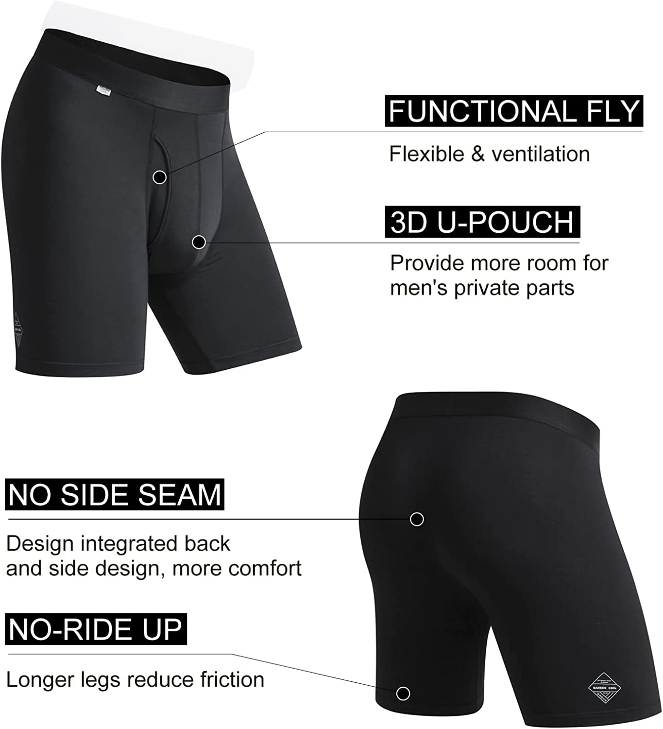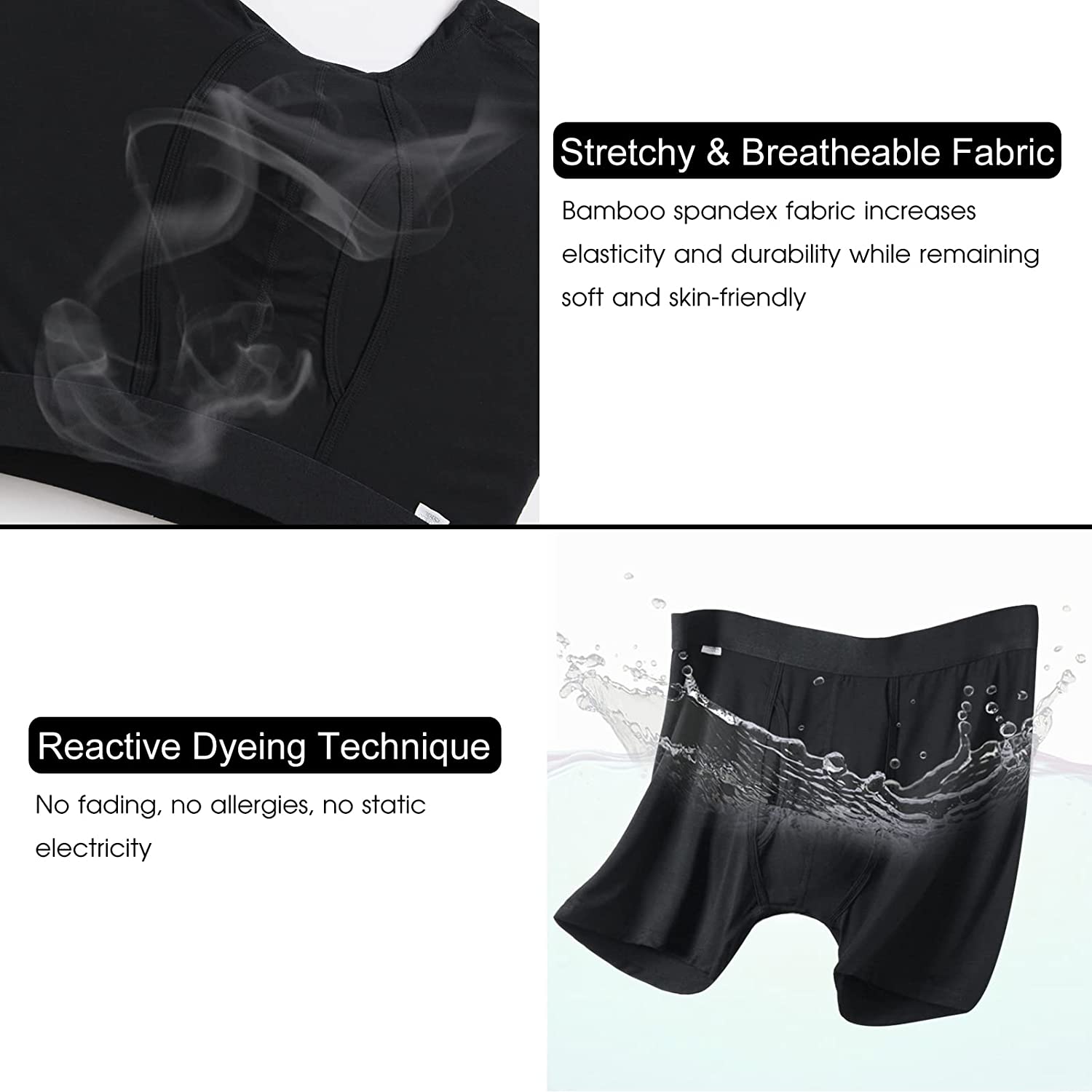 【NO-RIDE-UP】: This fabric is Bamboo Viscose & Spandex, which is a lightweight, breathable, stretchy pair that won't fade or shrink fabric. Bamboo fabric has a natural moisture absorption and perspiration functionThe design of lengthen the leg will more securely wrap the important parts of men, and effectively reduce the friction between the legs.