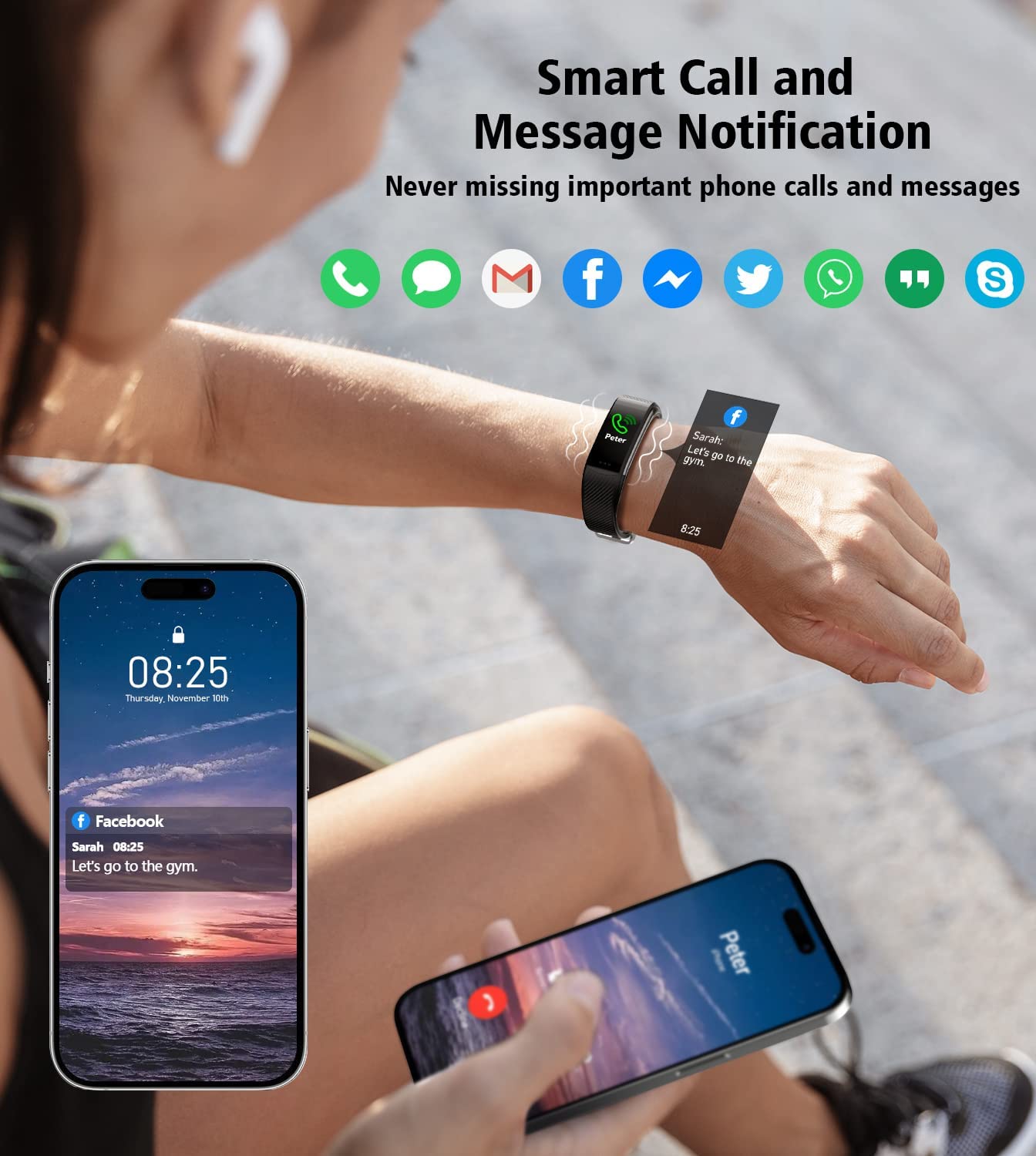 【Real-time Calls and Messages Notification】Receiving a buzzing notification on your wrist for incoming calls, text and app messages including Facebook,Twitter, WhatsApp, Messenger and more. For inconing calls, you coulld check the caller’s name or phone number on the smart watch to decide whether you need to reach out for your phone to answer the call or not. For text and app messages, except for a buzzing notification, you could also read the whole messages on your watch directly.