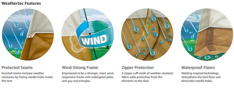 • WeatherTec system and rainfly keep tent interior dry and comfortable