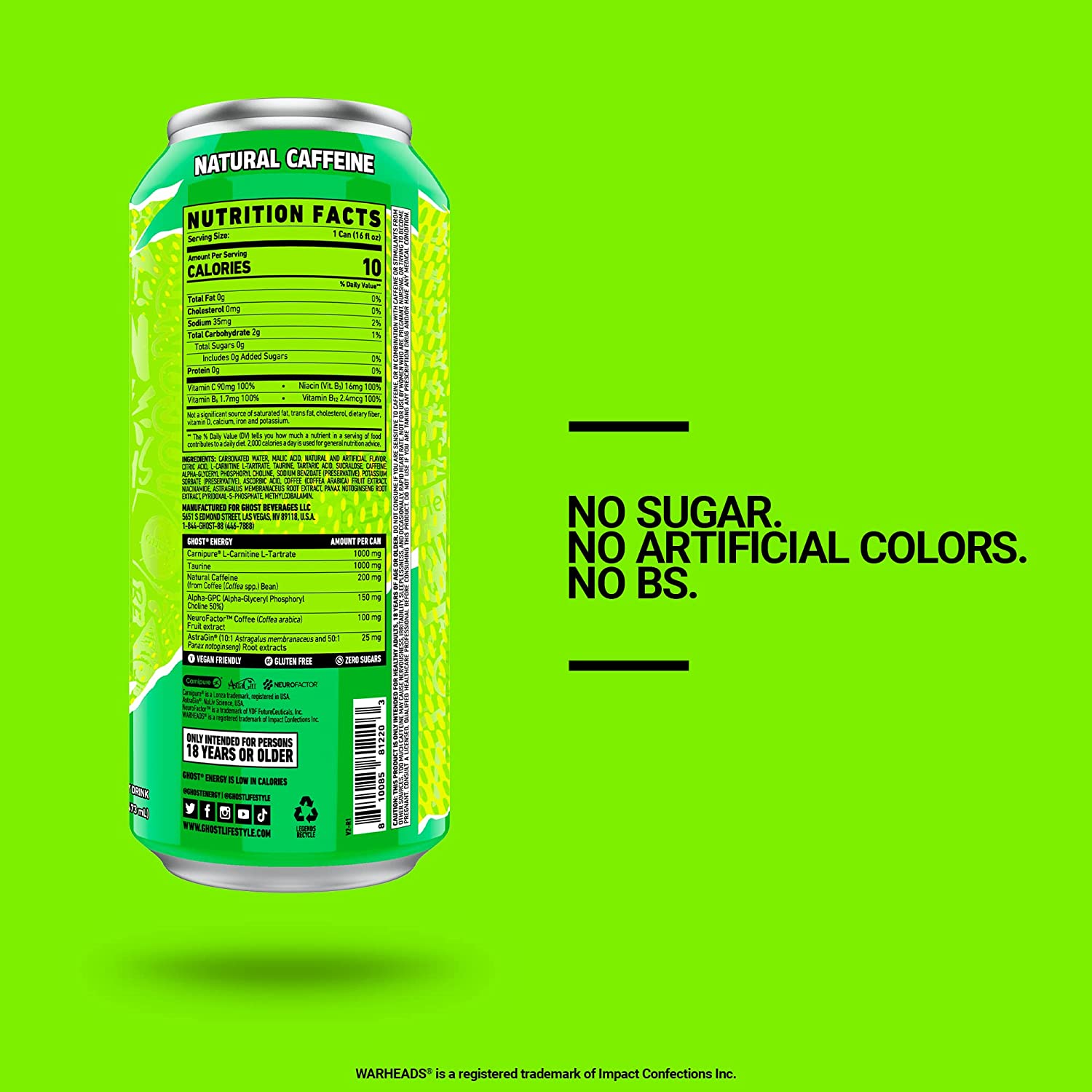 Feel-Good Energy: GHOST ENERGY is the fully transparent, fully loaded energy drink we’ve all been waiting for. No sugar. No artificial colors. No BS. Authentic Warheads Sour Green Apple flavor. 12-pack.