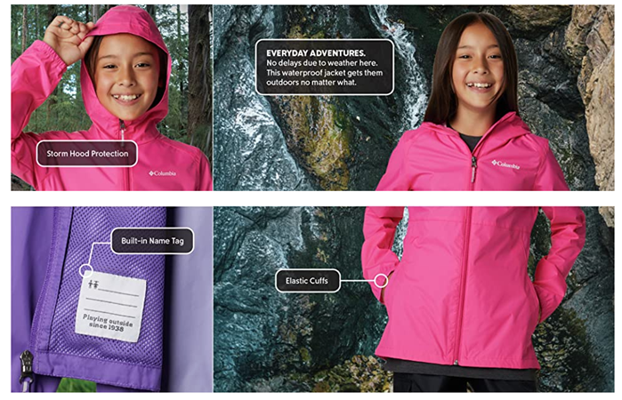- COMFORTABLE RAIN JACKET: The Columbia Girl's Switchback II Jacket is a hooded waterproof rain coat with elastic cuffs, and a drop tail, designed to keep your child cozy and dry.