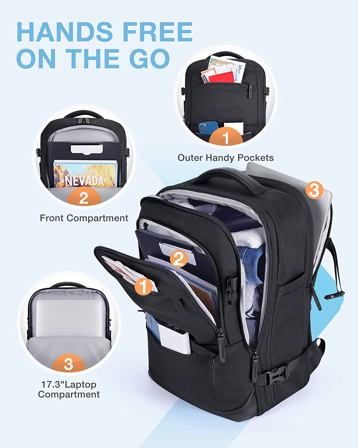 AIRLINE APPROVED: Travel backpack size: 20.47*13.38*7.87 inches. Maximum capacity: 40L, carry-on backpack meets the size required by almost all major airlines and fits in the overhead compartment and under the seat. Of course the lie-flat opening design helps you get through security quickly. This travel backpack is perfect for weekend trips, business trips, hiking, camping, etc.