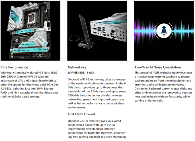 • AI Motherboard : AI Overclocking, AI cooling, AI networking(GameFirst VI) and AI noise cancellation